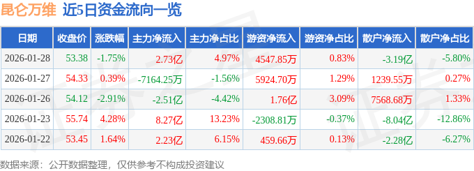 1月28日的资金流向数据方面,主力资金净流入2.73亿元,占总成交额4.97%,游资资金净流入4547.85万元,占总成交额0.83%,散户资金净流出3.19亿元,占总成交额5.8%。