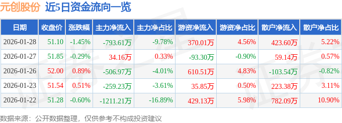 证券之星消息,截至2026年1月28日收盘,元创股份(001325)报收于51.1元,下跌1.45%,换手率8.05%,成交量1.58万手,成交额8113.33万元。