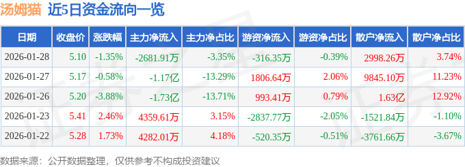 证券之星消息,截至2026年1月28日收盘,汤姆猫(300459)报收于5.1元,下跌1.35%,换手率4.71%,成交量154.98万手,成交额8.01亿元。