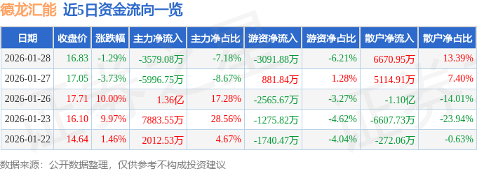 证券之星消息,截至2026年1月28日收盘,德龙汇能(000593)报收于16.83元,下跌1.29%,换手率8.37%,成交量30.01万手,成交额4.98亿元。
