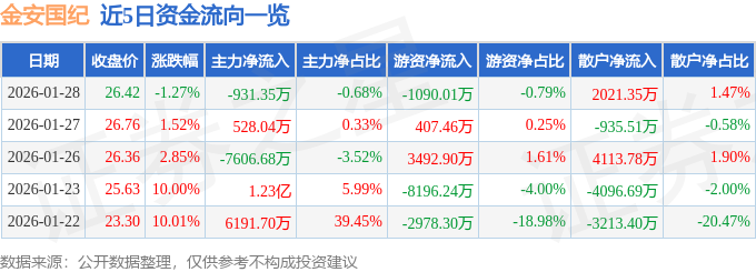 证券之星消息,截至2026年1月28日收盘,金安国纪(002636)报收于26.42元,下跌1.27%,换手率7.25%,成交量52.49万手,成交额13.73亿元。