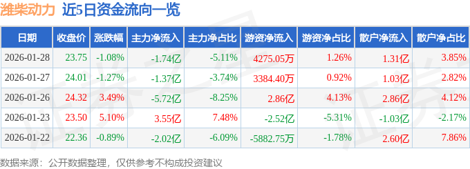 证券之星消息,截至2026年1月28日收盘,潍柴动力(000338)报收于23.75元,下跌1.08%,换手率2.84%,成交量142.14万手,成交额33.99亿元。