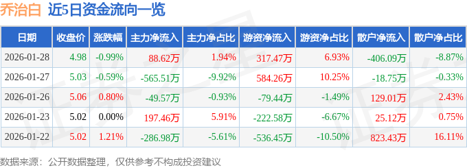 1月28日的资金流向数据方面,主力资金净流入88.62万元,占总成交额1.94%,游资资金净流入317.47万元,占总成交额6.93%,散户资金净流出406.09万元,占总成交额8.87%。