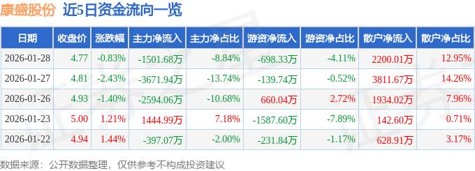 证券之星消息,截至2026年1月28日收盘,康盛股份(002418)报收于4.77元,下跌0.83%,换手率3.14%,成交量35.73万手,成交额1.7亿元。
