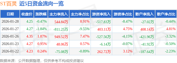 证券之星消息,截至2026年1月28日收盘,ST百灵(002424)报收于4.25元,下跌0.47%,换手率1.18%,成交量14.35万手,成交额6113.37万元。