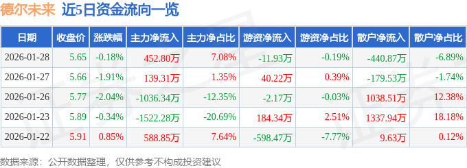 证券之星消息,截至2026年1月28日收盘,德尔未来(002631)报收于5.65元,下跌0.18%,换手率1.43%,成交量11.35万手,成交额6397.59万元。