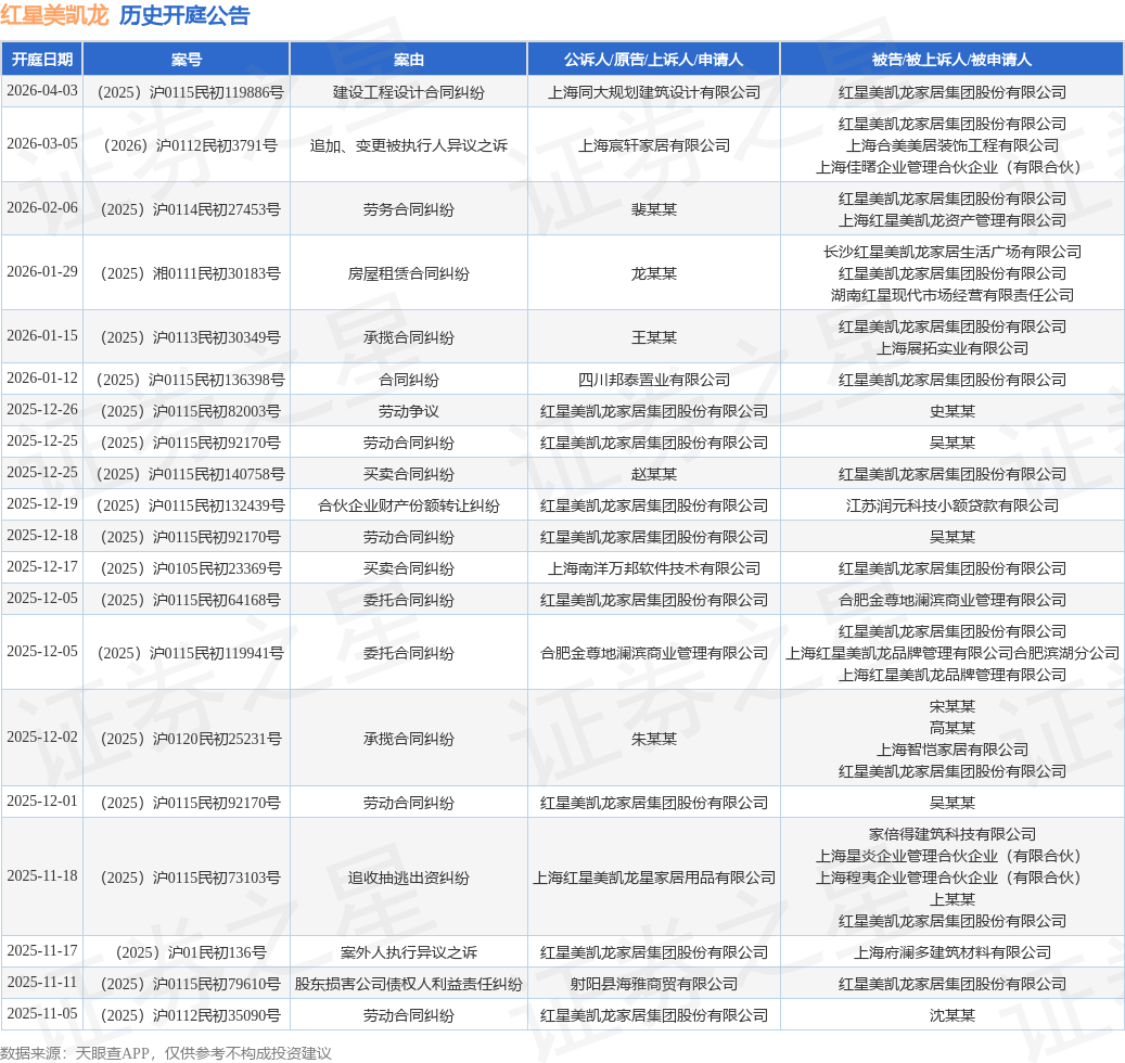 案号:(2025)湘0111民初30183号根据统计,近一年内以红星美凯龙家居集团股份有限公司为当事人的历史开庭公告有65则,其中案由为“劳动合同纠纷”的公告以15则居首,其次为“劳动争议”有9则,“委托合同纠纷”有7则。历史开庭公告(前20条)如下: