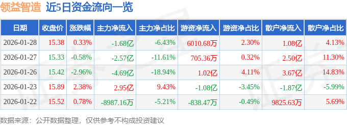 证券之星消息,截至2026年1月28日收盘,领益智造(002600)报收于15.38元,上涨0.33%,换手率2.37%,成交量170.88万手,成交额26.08亿元。