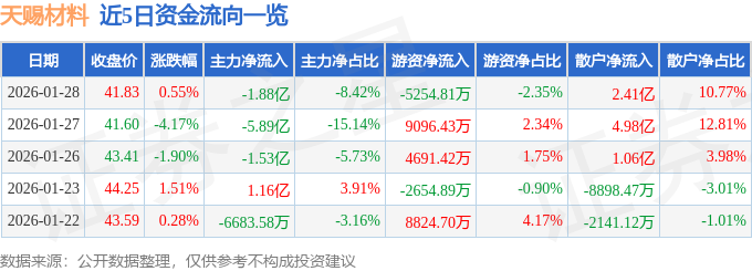 证券之星消息,截至2026年1月28日收盘,天赐材料(002709)报收于41.83元,上涨0.55%,换手率3.57%,成交量53.74万手,成交额22.32亿元。