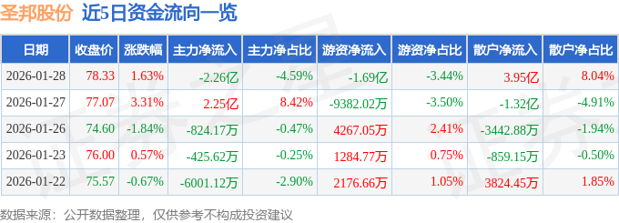 证券之星消息,截至2026年1月28日收盘,圣邦股份(300661)报收于78.33元,上涨1.63%,换手率10.25%,成交量60.77万手,成交额49.14亿元。