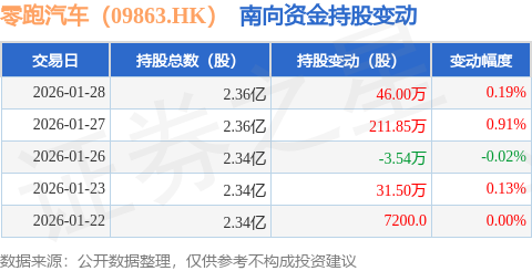 证券之星消息,1月28日南向资金增持46.0万股零跑汽车(09863.HK)。近5个交易日中,获南向资金增持的有4天,累计净增持286.53万股。近20个交易日中,获南向资金增持的有17天,累计净增持2030.49万股。截至目前,南向资金持有零跑汽车(09863.HK)2.36亿股,占公司已发行普通股的20.9%。