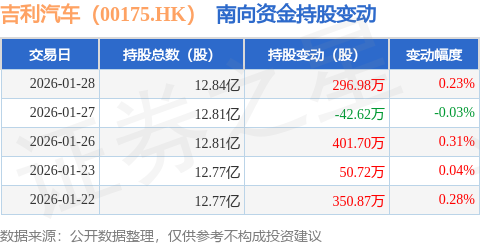 证券之星消息,1月28日南向资金增持296.98万股吉利汽车(00175.HK)。近5个交易日中,获南向资金增持的有4天,累计净增持1057.65万股。近20个交易日中,获南向资金增持的有14天,累计净增持3703.43万股。截至目前,南向资金持有吉利汽车(00175.HK)12.84亿股,占公司已发行普通股的11.77%。