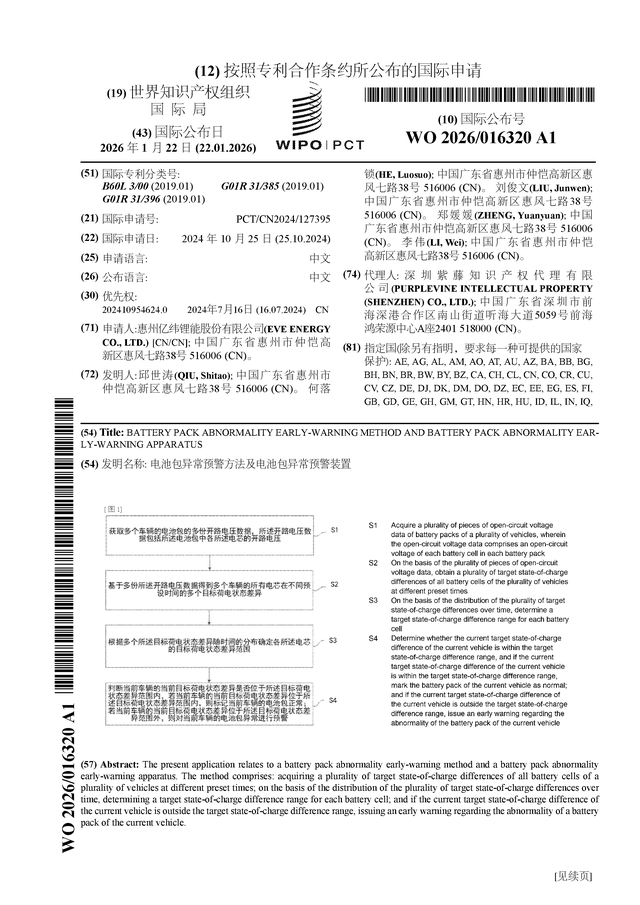 证券之星消息,根据企查查数据显示亿纬锂能(300014)公布了一项国际专利申请,专利名为“电池包异常预警方法及电池包异常预警装置”,专利申请号为PCT/CN2024/127395,国际公布日为2026年1月22日。