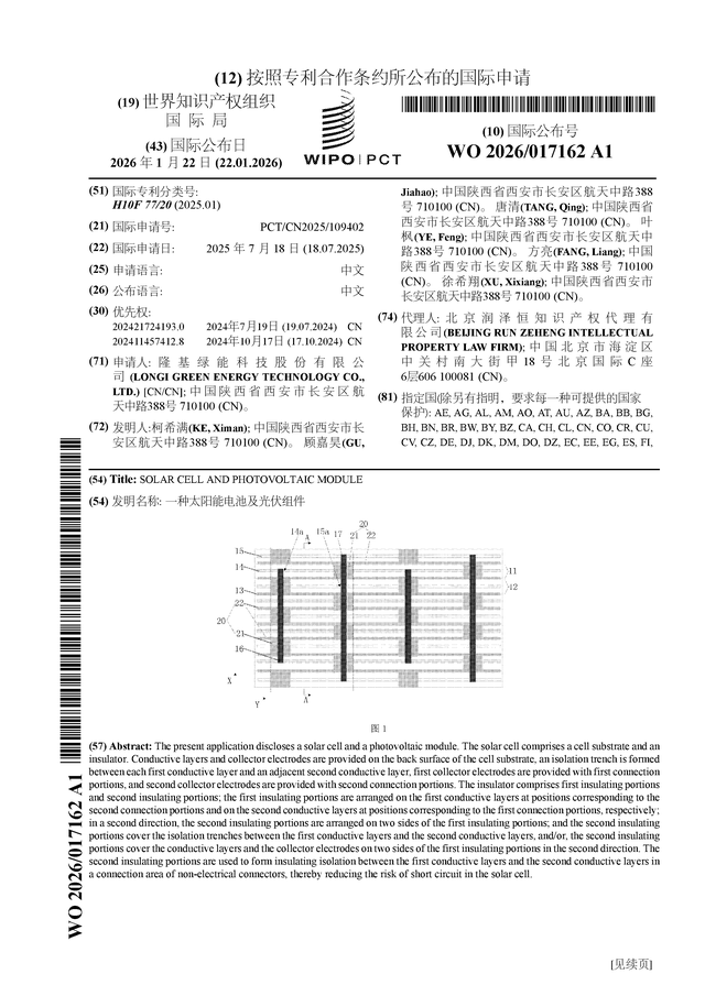 证券之星消息,根据企查查数据显示隆基绿能(601012)公布了一项国际专利申请,专利名为“一种太阳能电池及光伏组件”,专利申请号为PCT/CN2025/109402,国际公布日为2026年1月22日。