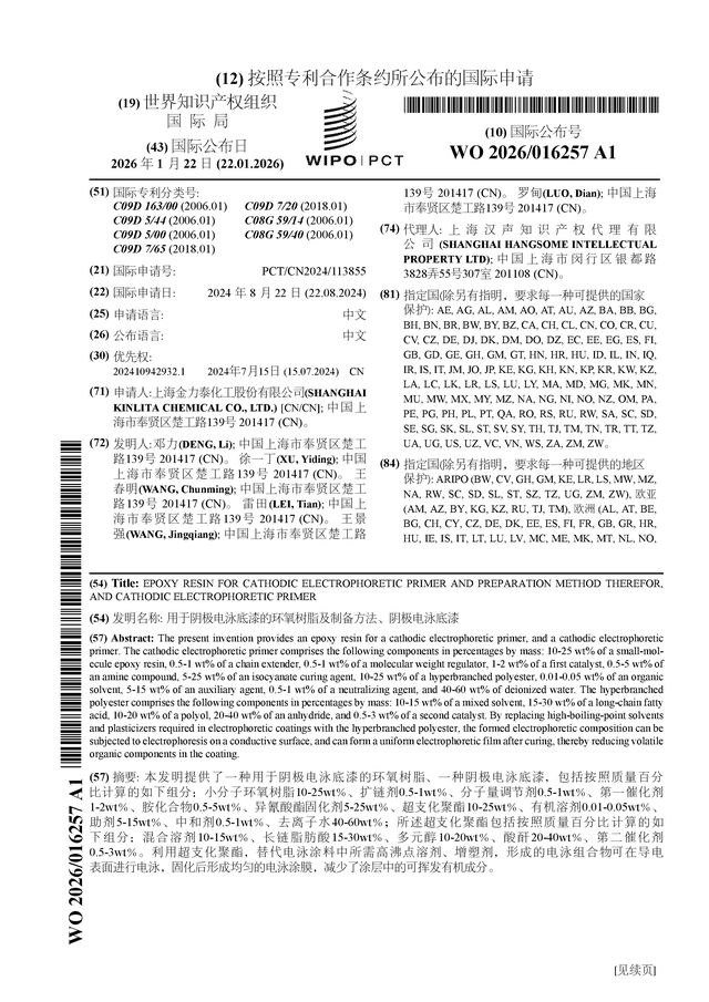 证券之星消息,根据企查查数据显示*ST金泰(300225)公布了一项国际专利申请,专利名为“用于阴极电泳底漆的环氧树脂及制备方法、阴极电泳底漆”,专利申请号为PCT/CN2024/113855,国际公布日为2026年1月22日。