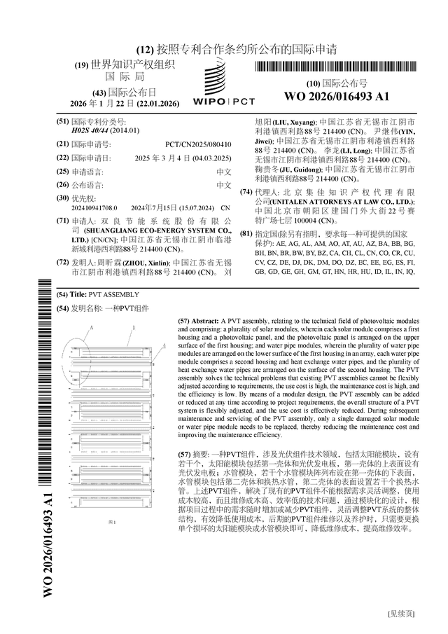 证券之星消息,根据企查查数据显示双良节能(600481)公布了一项国际专利申请,专利名为“一种PVT组件”,专利申请号为PCT/CN2025/080410,国际公布日为2026年1月22日。