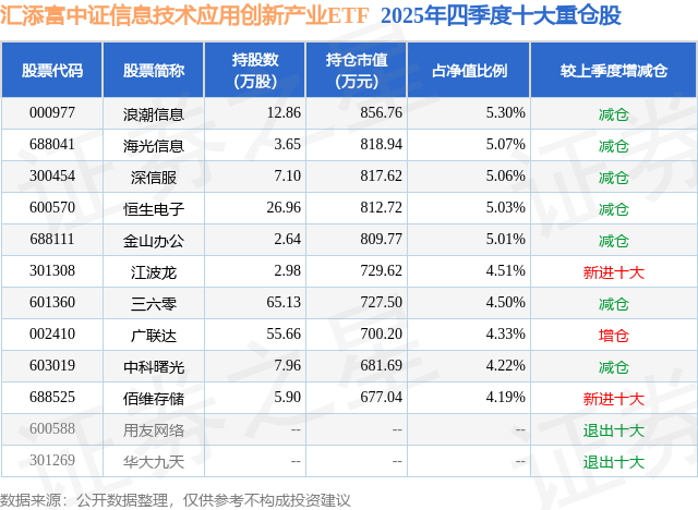 汇添富中证信息技术应用创新产业ETF基金成立于2024年4月1日,基金经理为罗昊,基金跟踪标的为中证信息技术应用创新产业指数,成立以来超额回报为6.46%,近一个月超额回报为-0.29%。最新披露的基金持仓数据显示,截止2025年12月31日,该基金第一大重仓股为浪潮信息(000977),持股占比为5.3%。