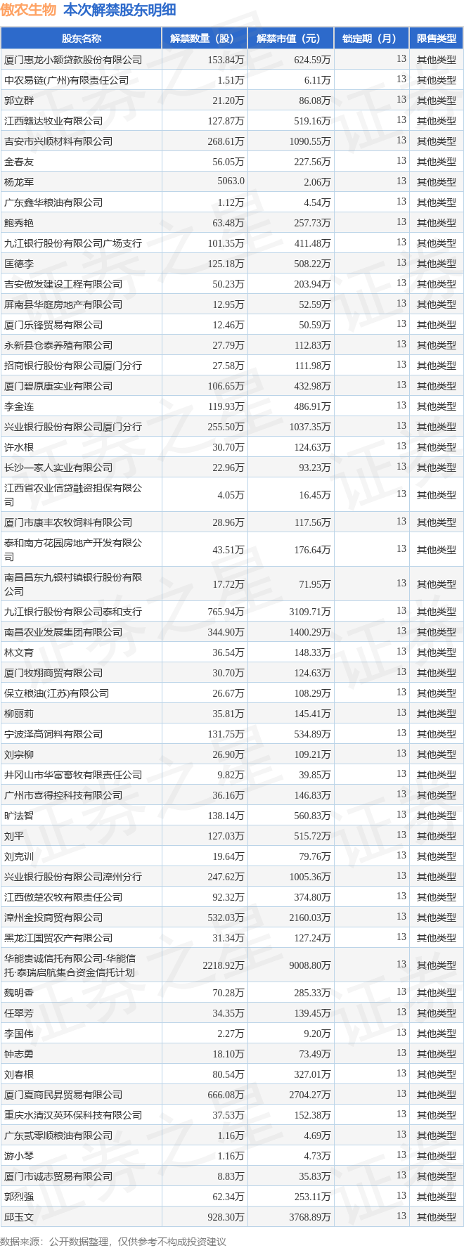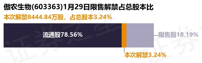 证券之星消息,根据市场公开信息整理,傲农生物(603363)于1月29日将有8444.84万股限售股份解禁,为公司其他类型,占公司总股本3.24%。(本次数据根据历史公告整理得出,实际情况以上市公司最新公告为准)最近一年内,该股累计解禁5.77亿股,占总股本的22.17%。本次解禁后,公司还有4.74亿股限售股份,占总股本18.19%。具体如下图所示: