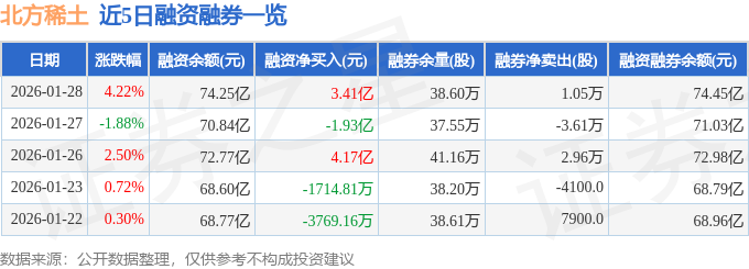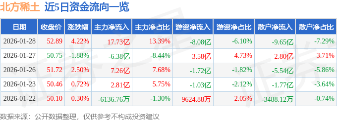 证券之星消息,截至2026年1月28日收盘,北方稀土(600111)报收于52.89元,上涨4.22%,换手率7.06%,成交量255.4万手,成交额132.39亿元。