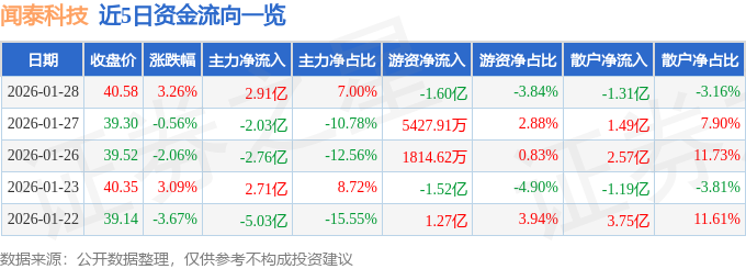 1月28日的资金流向数据方面,主力资金净流入2.91亿元,占总成交额7.0%,游资资金净流出1.6亿元,占总成交额3.84%,散户资金净流出1.31亿元,占总成交额3.16%。