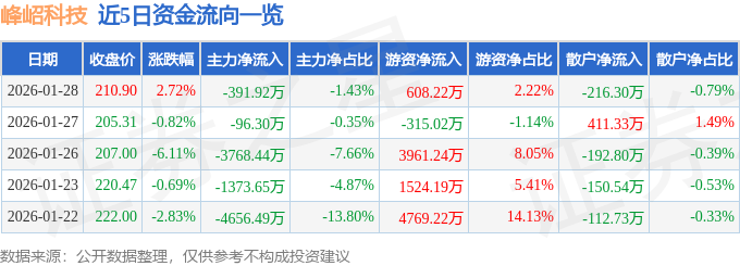 1月28日的资金流向数据方面,主力资金净流出391.92万元,占总成交额1.43%,游资资金净流入608.22万元,占总成交额2.22%,散户资金净流出216.3万元,占总成交额0.79%。