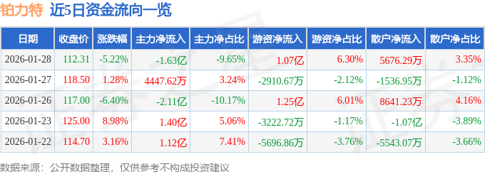 证券之星消息,截至2026年1月28日收盘,铂力特(688333)报收于112.31元,下跌5.22%,换手率5.41%,成交量14.84万手,成交额16.93亿元。