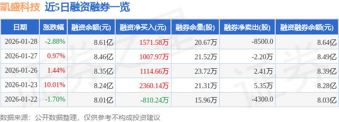 凯盛科技融资融券信息显示,融资方面,当日融资买入1.02亿元,融资偿还8649.0万元,融资净买入1571.58万元,连续3日净买入累计3694.21万元。融券方面,融券卖出1500.0股,融券偿还1.0万股,融券余量20.67万股,融券余额314.18万元。融资融券余额8.64亿元。