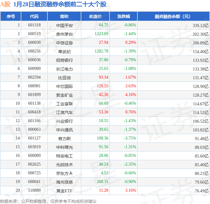 A股融资融券余额前三分别为:中国平安(601318)融资融券余额339.12亿元、贵州茅台(600519)融资融券余额202.3亿元、中信证券(600030)融资融券余额200.89亿元,前20具体见下表: