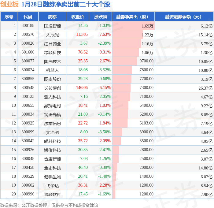 创业板融券净卖出前三分别为:国投智能(300188)融券净卖出1.69万股、太辰光(300570)融券净卖出1.22万股、红日药业(300026)融券净卖出1.16万股,前20具体见下表: