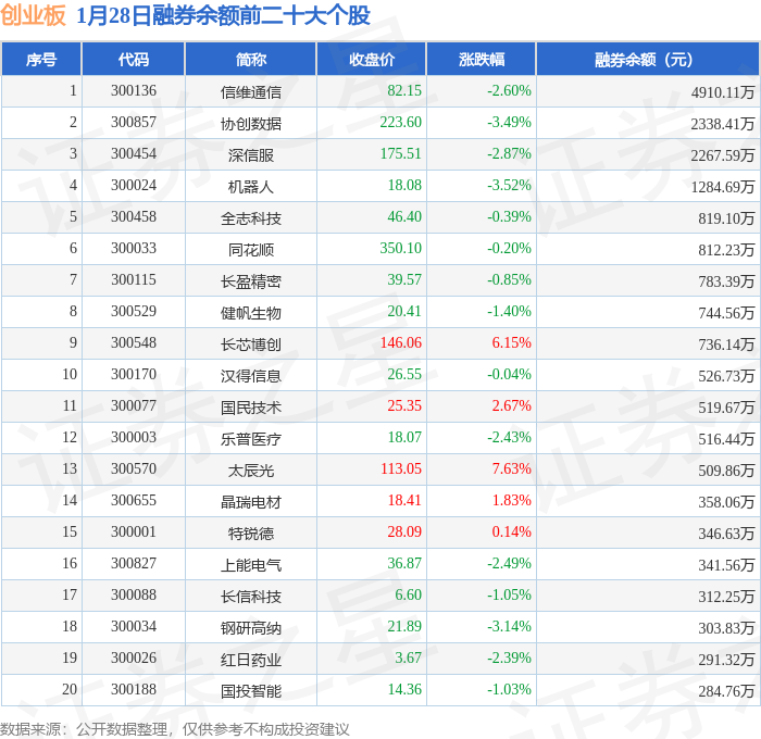 创业板融券余额前三分别为:信维通信(300136)融券余额4910.11万元、协创数据(300857)融券余额2338.41万元、深信服(300454)融券余额2267.59万元,前20具体见下表: