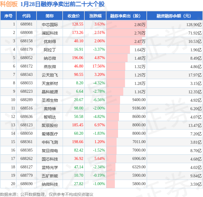 科创板融券净卖出前三分别为:中芯国际(688981)融券净卖出2.8万股、澜起科技(688008)融券净卖出2.7万股、优刻得(688158)融券净卖出2.47万股,前20具体见下表: