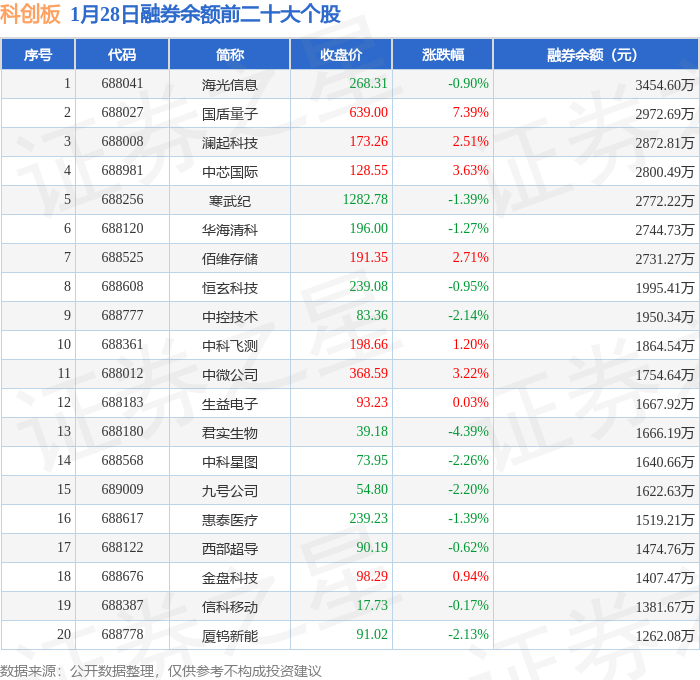 科创板融券余额前三分别为:海光信息(688041)融券余额3454.6万元、国盾量子(688027)融券余额2972.69万元、澜起科技(688008)融券余额2872.81万元,前20具体见下表: