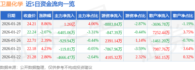 证券之星消息,截至2026年1月28日收盘,卫星化学(002648)报收于24.21元,上涨8.86%,换手率3.87%,成交量130.3万手,成交额30.96亿元。