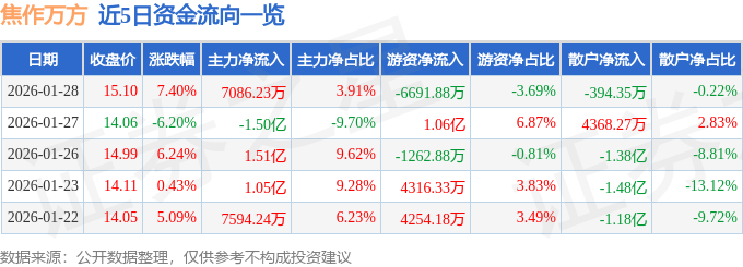 证券之星消息,截至2026年1月28日收盘,焦作万方(000612)报收于15.1元,上涨7.4%,换手率10.26%,成交量122.19万手,成交额18.11亿元。