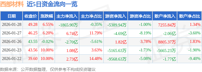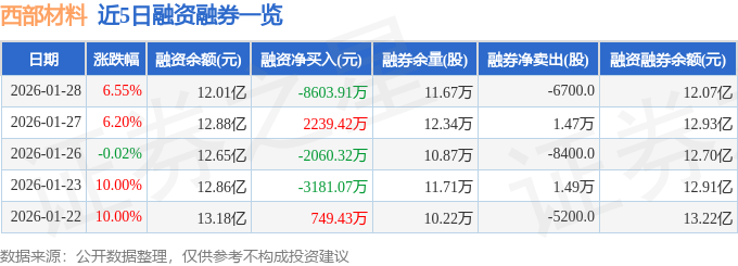 证券之星消息,截至2026年1月28日收盘,西部材料(002149)报收于49.28元,上涨6.55%,换手率22.98%,成交量112.19万手,成交额53.97亿元。