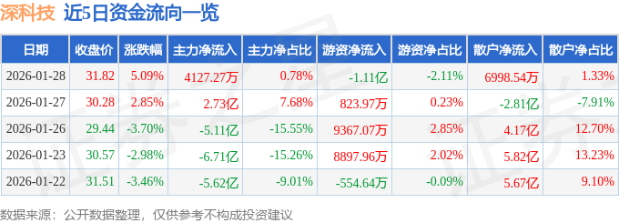 证券之星消息,截至2026年1月28日收盘,深科技(000021)报收于31.82元,上涨5.09%,换手率10.54%,成交量165.68万手,成交额52.81亿元。