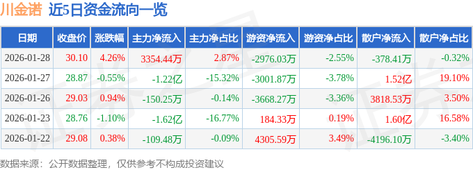证券之星消息,截至2026年1月28日收盘,川金诺(300505)报收于30.1元,上涨4.26%,换手率18.21%,成交量39.58万手,成交额11.67亿元。