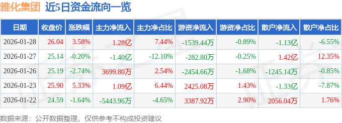 证券之星消息,截至2026年1月28日收盘,雅化集团(002497)报收于26.04元,上涨3.58%,换手率6.32%,成交量66.87万手,成交额17.23亿元。