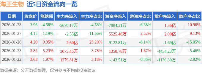 证券之星消息,截至2026年1月28日收盘,海王生物(000078)报收于3.96元,下跌4.58%,换手率11.73%,成交量308.15万手,成交额12.38亿元。