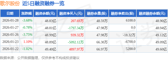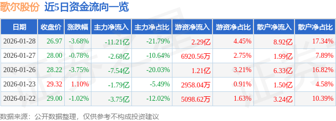 证券之星消息,截至2026年1月28日收盘,歌尔股份(002241)报收于26.97元,下跌3.68%,换手率6.03%,成交量189.19万手,成交额51.44亿元。