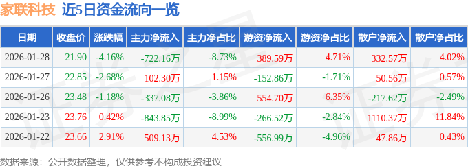 证券之星消息,截至2026年1月28日收盘,家联科技(301193)报收于21.9元,下跌4.16%,换手率2.69%,成交量3.72万手,成交额8268.98万元。