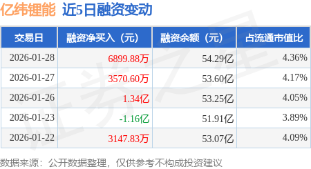 证券之星消息,1月28日,亿纬锂能(300014)融资买入4.64亿元,融资偿还3.95亿元,融资净买入6899.88万元,融资余额54.29亿元,近3个交易日已连续净买入累计2.39亿元,近20个交易日中有11个交易日出现融资净买入。