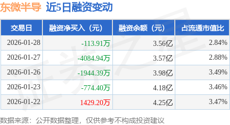 证券之星消息,1月28日,东微半导(688261)融资买入5501.65万元,融资偿还5615.57万元,融资净卖出113.91万元,融资余额3.56亿元。