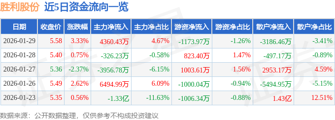 证券之星消息,截至2026年1月29日收盘,胜利股份(000407)报收于5.58元,上涨3.33%,换手率19.4%,成交量169.93万手,成交额9.34亿元。