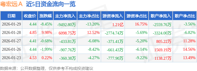 证券之星消息,截至2026年1月29日收盘,粤宏远A(000573)报收于4.44元,下跌8.45%,换手率25.23%,成交量159.72万手,成交额7.19亿元。