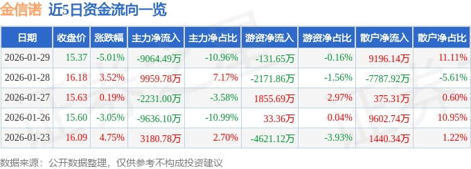 证券之星消息,截至2026年1月29日收盘,金信诺(300252)报收于15.37元,下跌5.01%,换手率9.5%,成交量53.11万手,成交额8.27亿元。