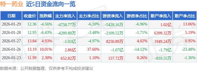 证券之星消息,截至2026年1月29日收盘,特一药业(002728)报收于12.36元,下跌4.56%,换手率16.67%,成交量62.82万手,成交额7.8亿元。