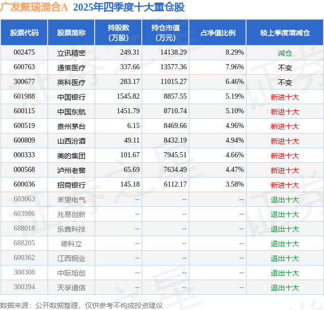 根据2025基金年报公募基金重仓股数据,重仓该股的公募基金共8家,其中持有数量最多的公募基金为广发基金的广发聚瑞混合A。广发聚瑞混合A目前规模为16.39亿元,最新净值4.9646(1月28日),较上一交易日下跌0.64%,近一年上涨32.21%。该公募基金现任基金经理为费逸。费逸在任的基金产品包括:广发鑫益混合,管理时间为2018年8月2日至今,期间收益率为218.13%;广发瑞安精选股票A,管理时间为2020年12月16日至今,期间收益率为20.81%;广发盛兴混合A,管理时间为2021年2月2日至今,期间收益率为15.42%。