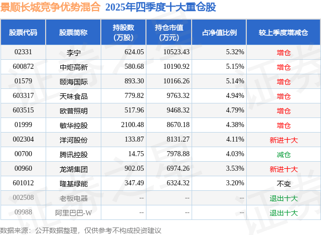 根据2025基金年报公募基金重仓股数据,重仓该股的公募基金共10家,其中持有数量最多的公募基金为景顺长城基金的景顺长城竞争优势混合。景顺长城竞争优势混合目前规模为19.78亿元,最新净值0.9427(1月28日),较上一交易日上涨0.03%,近一年上涨19.63%。该公募基金现任基金经理为刘苏。刘苏在任的基金产品包括:景顺长城动力平衡混合,管理时间为2015年9月29日至今,期间收益率为147.77%;景顺长城品质成长混合A,管理时间为2020年1月3日至今,期间收益率为34.25%;景顺长城研究驱动三年持有混合,管理时间为2022年4月7日至今,期间收益率为19.74%。