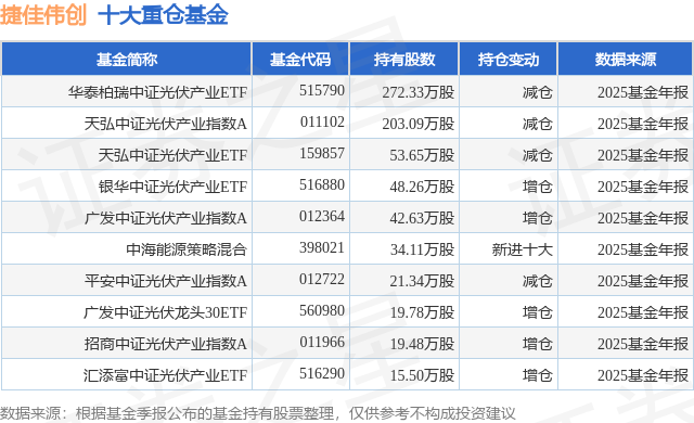 根据2025基金年报公募基金重仓股数据,重仓该股的公募基金共32家,其中持有数量最多的公募基金为华泰柏瑞基金的华泰柏瑞中证光伏产业ETF。华泰柏瑞中证光伏产业ETF目前规模为112.53亿元,最新净值1.1032(1月28日),较上一交易日下跌2.26%,近一年上涨54.06%。该公募基金现任基金经理为李茜 李沐阳。李茜在任的基金产品包括:华泰柏瑞上证红利ETF,管理时间为2019年11月5日至今,期间收益率为53.79%;华泰柏瑞中证港股通50ETF,管理时间为2020年12月30日至今,期间收益率为24.47%;华泰柏瑞中证物联网主题ETF,管理时间为2021年3月31日至今,期间收益率为55.01%。李沐阳在任的基金产品包括:华泰柏瑞光伏ETF联接A,管理时间为2021年8月17日至今,期间收益率为-32.63%;华泰柏瑞中韩半导体ETF(QDII),管理时间为2022年11月2日至今,期间收益率为218.6%;华泰柏瑞纳斯达克100ETF(QDII),管理时间为2023年3月1日至今,期间收益率为108.14%。